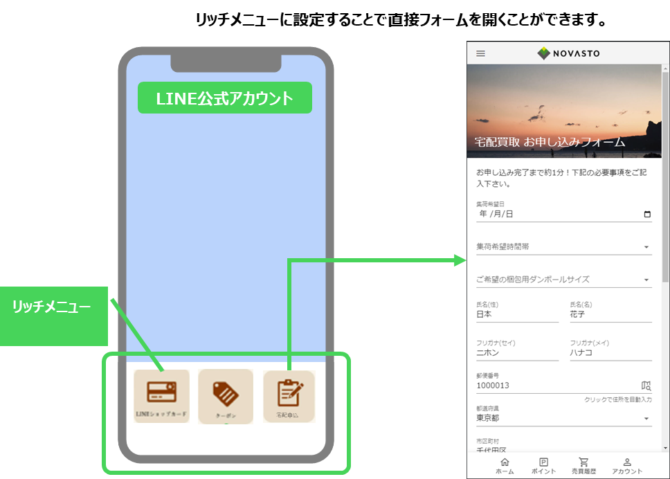LINEミニアプリのリッチメニューに設定を行うことで、宅配買取申込みフォームに直接遷移させることが可能です。 リッチメニューに設定するためにはパーマネントリンクを利用します。