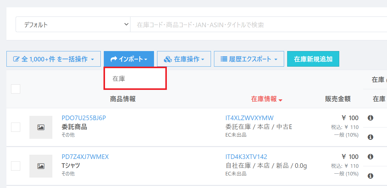【在庫リスト】より、CSVファイルをインポートすることで、棚番号の更新・削除を行うことができます。