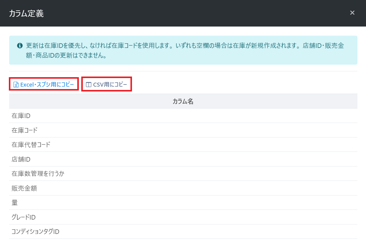 ③Excelファイルであれば「Excel・スプシ用にコピー」、CSVファイルであれば「CSV用にコピー」をクリックし、カラムをコピー