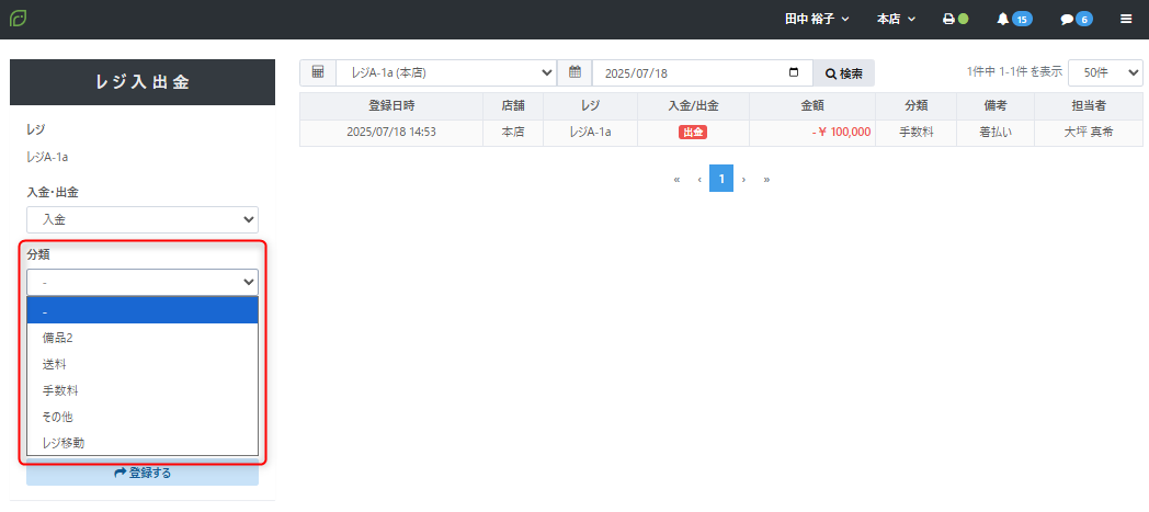 ・レジ入出金の分類名