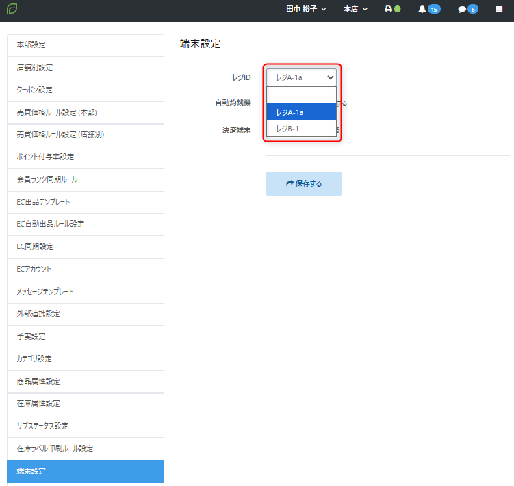 レジID | 【設定】メニューの【端末設定】に表示されるレジID名 | 不可 | 不可 |
