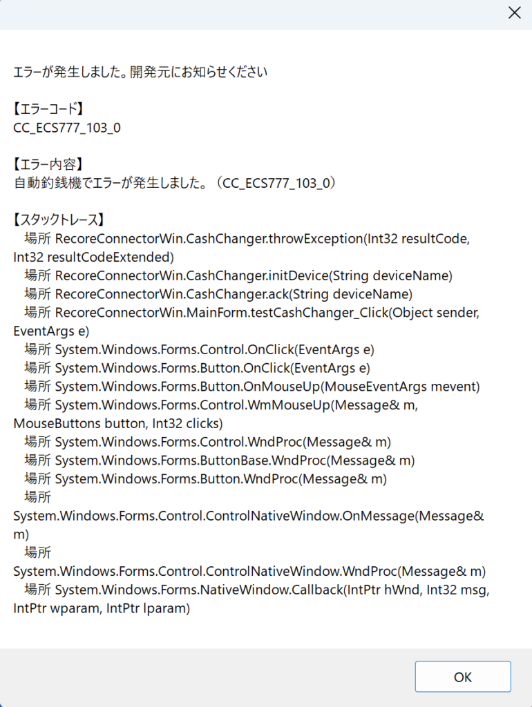 エラー内容:「自動釣銭機でエラーが発生しました。」