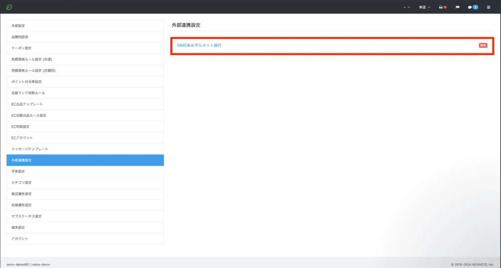 弊社より貴社のRECORE【設定>設定】メニューの【外部連携設定】より「GMOあおぞらネット銀行」の名称で連携枠を作成いたします。