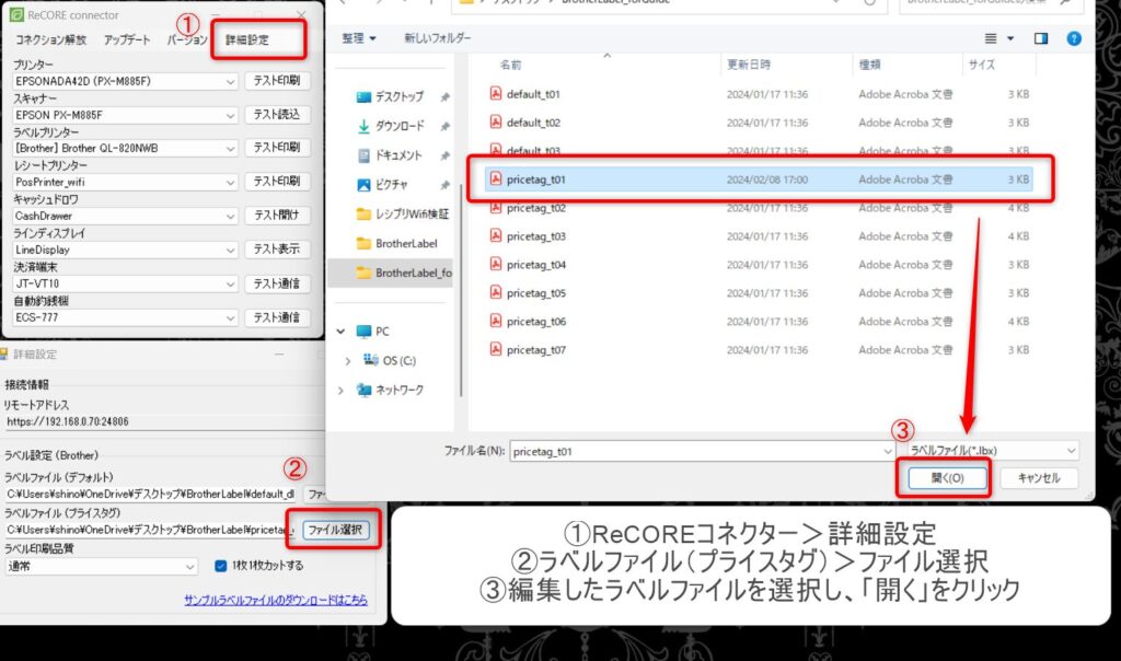 ReCOREコネクターの詳細設定でラベルファイルを設定する手順