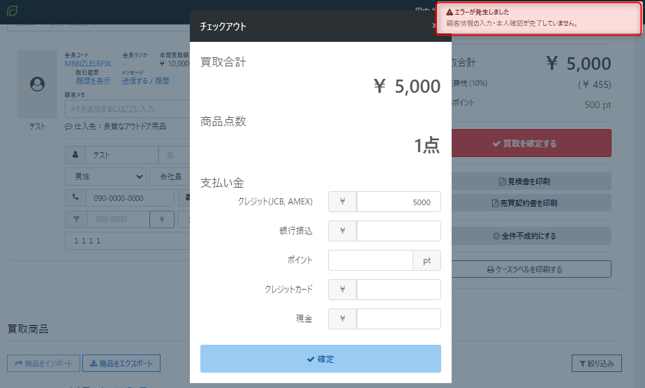 顧客情報の指定項目が未入力の状態や店舗から本人確認チェックがついていない状態では各買取ケースを確定できないようにすることで、顧客情報の入力漏れを防止することが可能です。