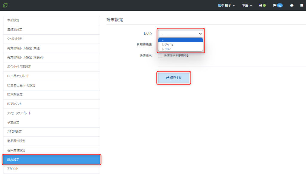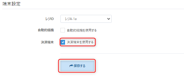【設定】メニューの【端末設定】項より、各アカウントで利用するレジに該当する【レジID】を選択のうえ、【保存する】ボタンをクリックします。