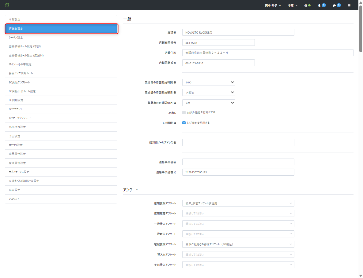 設定について、複数店舗でご利用いただいております場合、下記は全店舗で共通の設定となっております。