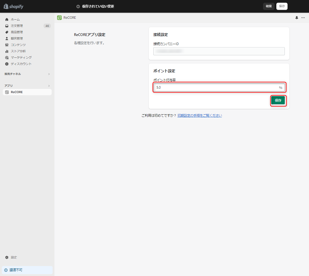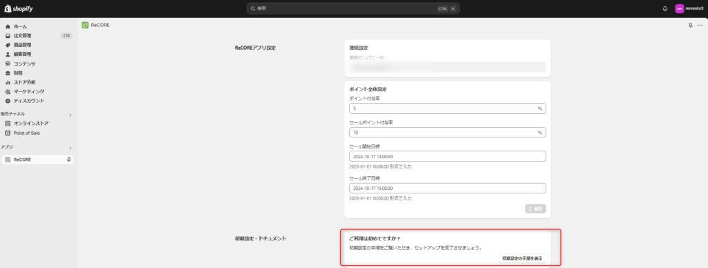 貴社側へ対応完了の連絡をします。 ShopifyにおけるReCOREアプリのポイント設定 からアプリブロック・ポイント付与率を設定ください。