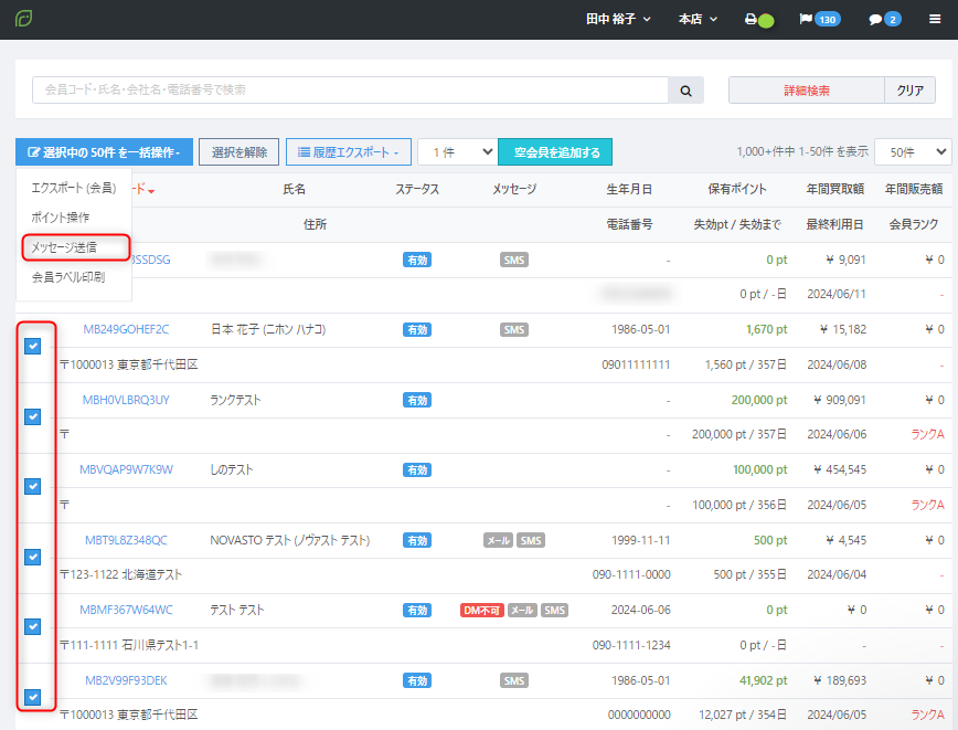 【会員>会員リスト】画面より対象者を選択のうえ、【全○件を一括操作】より【メッセージ送信】ボタンをクリック