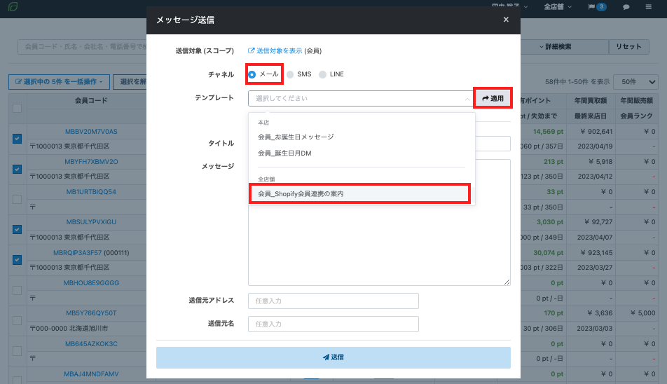 【メッセージ送信】画面において、【チャネル】送信したい方法を『メール』『SMS』『LINE』より選択のうえ、①で作成した【テンプレート】をクリックのうえ【適用】ボタンをクリックして反映させます。
