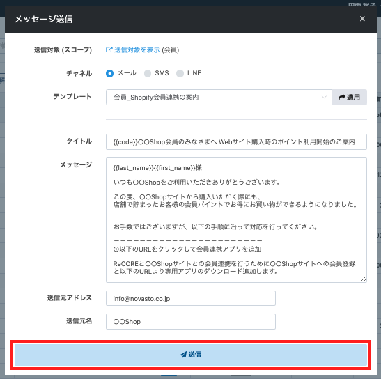 ReCOREより連携キーを案内するメッセージテンプレートを作成のうえ、会員リスト画面より一斉に会員へメッセージを送信し、メッセージ内容に従ってエンドユーザーよりShopifyへ連携を行っていただくという流れです。