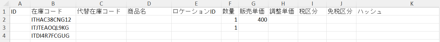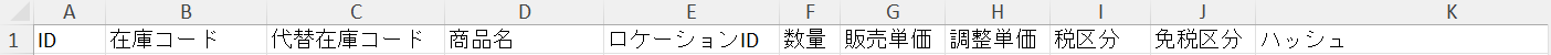 ID/在庫コード/代替在庫コード/商品名/ロケーションID/数量/販売単価/調整単価/税区分/免税区分/ハッシュ