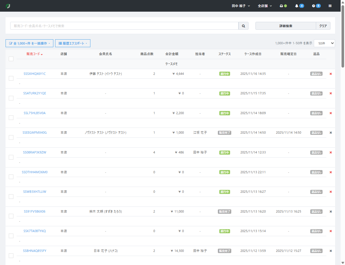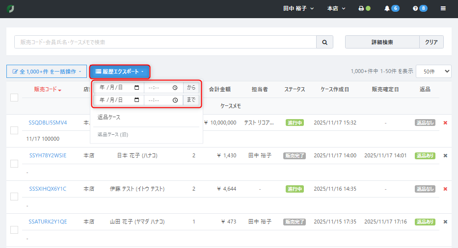 【店頭販売>ケースリスト】画面より【履歴エクスポート】をクリック