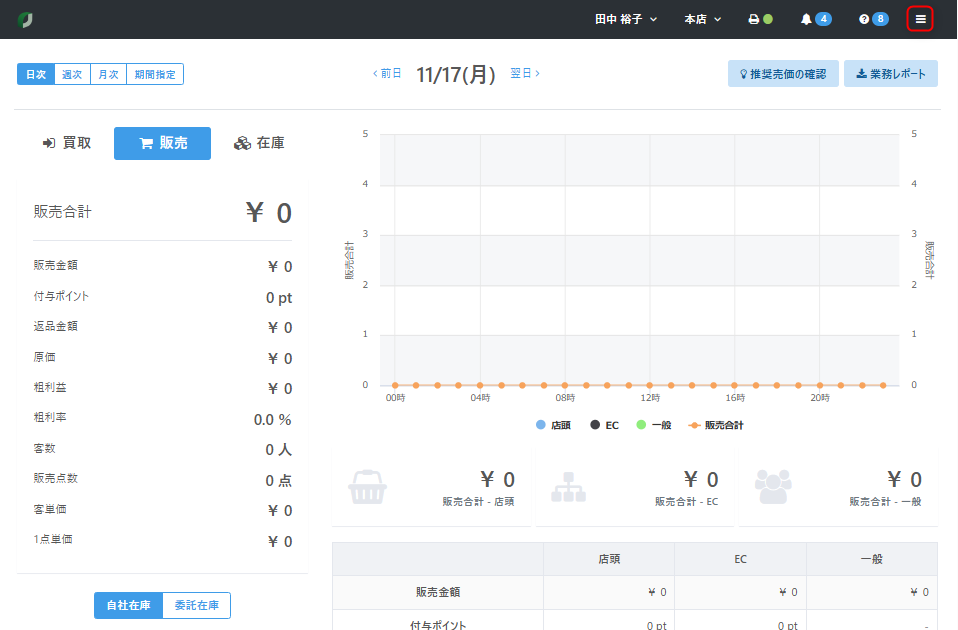 画面右上に表示されるスタッフ名店舗名を確認します。