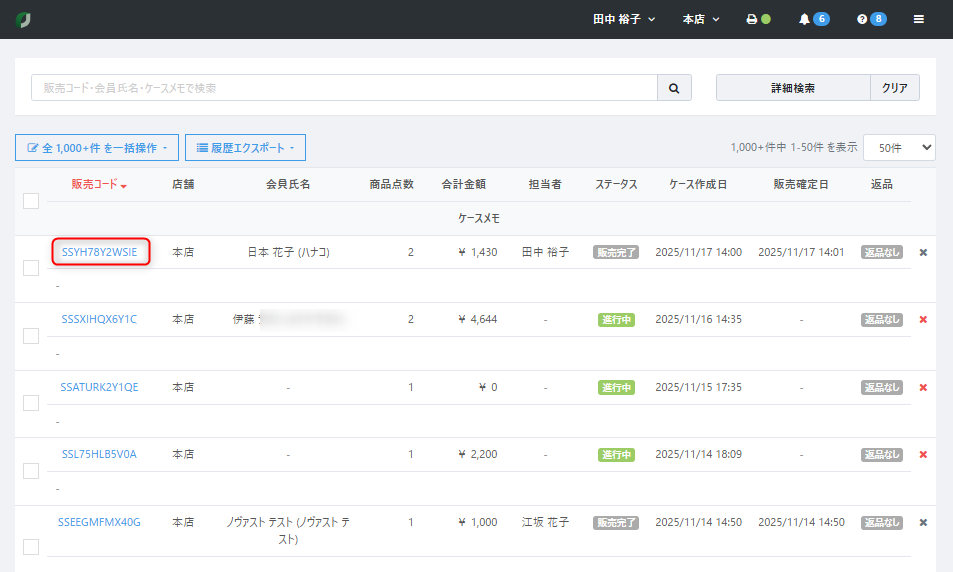 【店頭販売>ケースリスト】画面より該当ケースを検索のうえ、ケースコードをクリックし、該当のケース詳細画面を開く