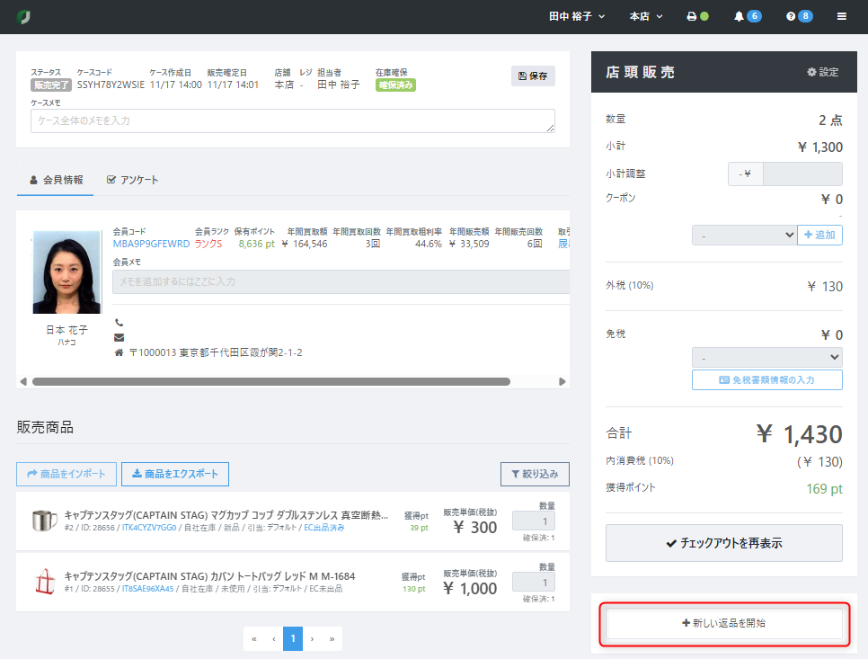 販売確定後、ケース内容の誤りを訂正することができませんので、【+新しい返品を開始】をクリックして返品処理のうえ、改めて新たなケースより正しい販売処理を行ってください。
