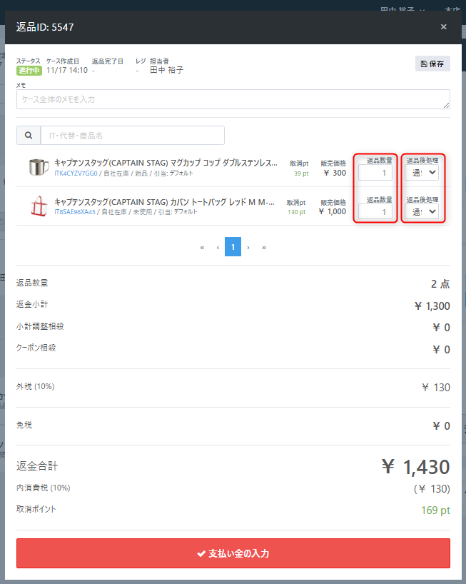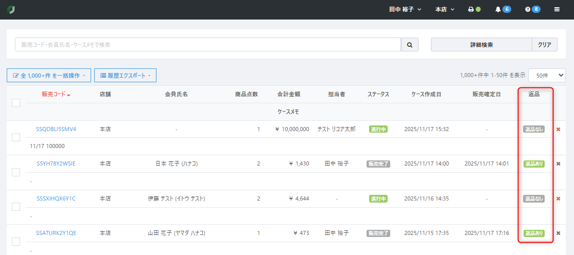 次のように販売した商品の一覧が返品ケースに表示されます。
