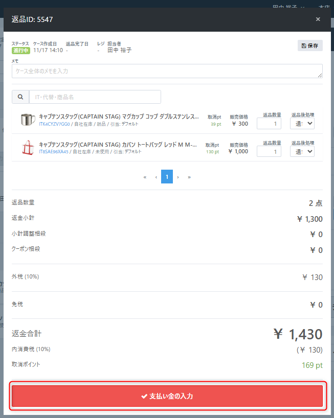 【返品数量】や【返品金額】を確認のうえ、間違いなければ【支払い金の入力】ボタンをクリックします。