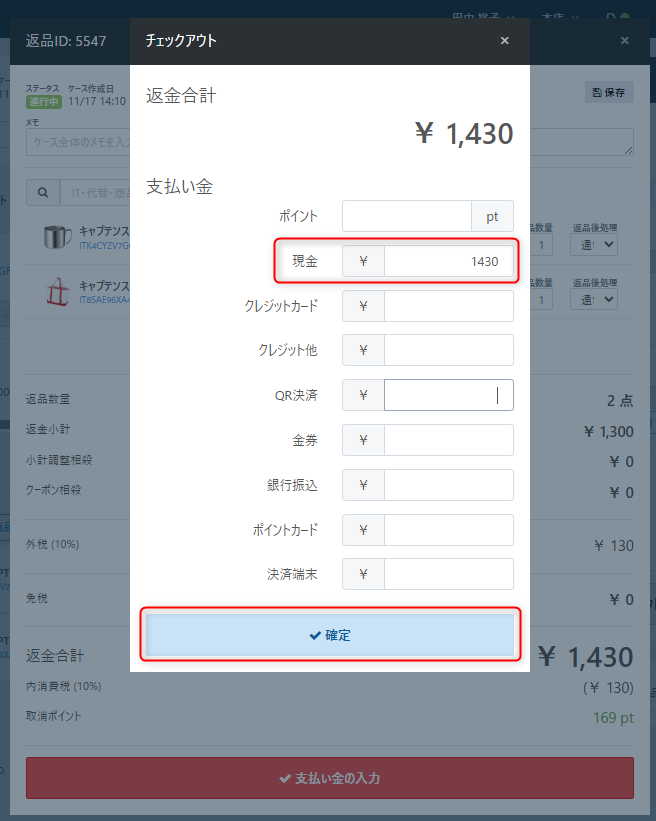 【チェックアウト】画面では、購入時の決済方法と同じ金種に返金金額を入力のうえ、【確定】ボタンをクリックします。