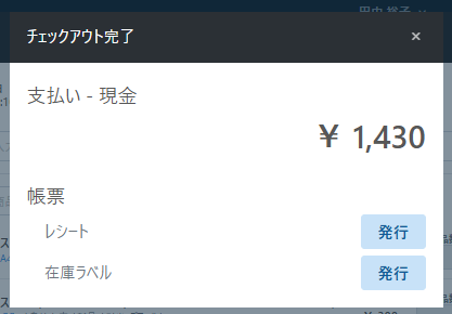 【チェックアウト完了】画面より、レシートの再発行や在庫ラベルの発行が可能です。
