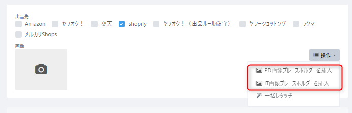【PD(IT)画像プレースホルダーを挿入】をクリックすることで、出品商品に紐づいているカタログや在庫に登録されている画像を出品画像として適用できる機能です。
