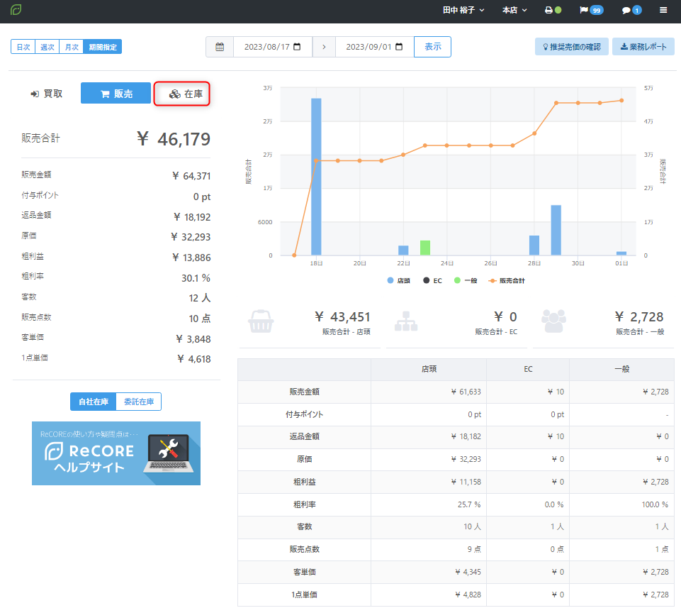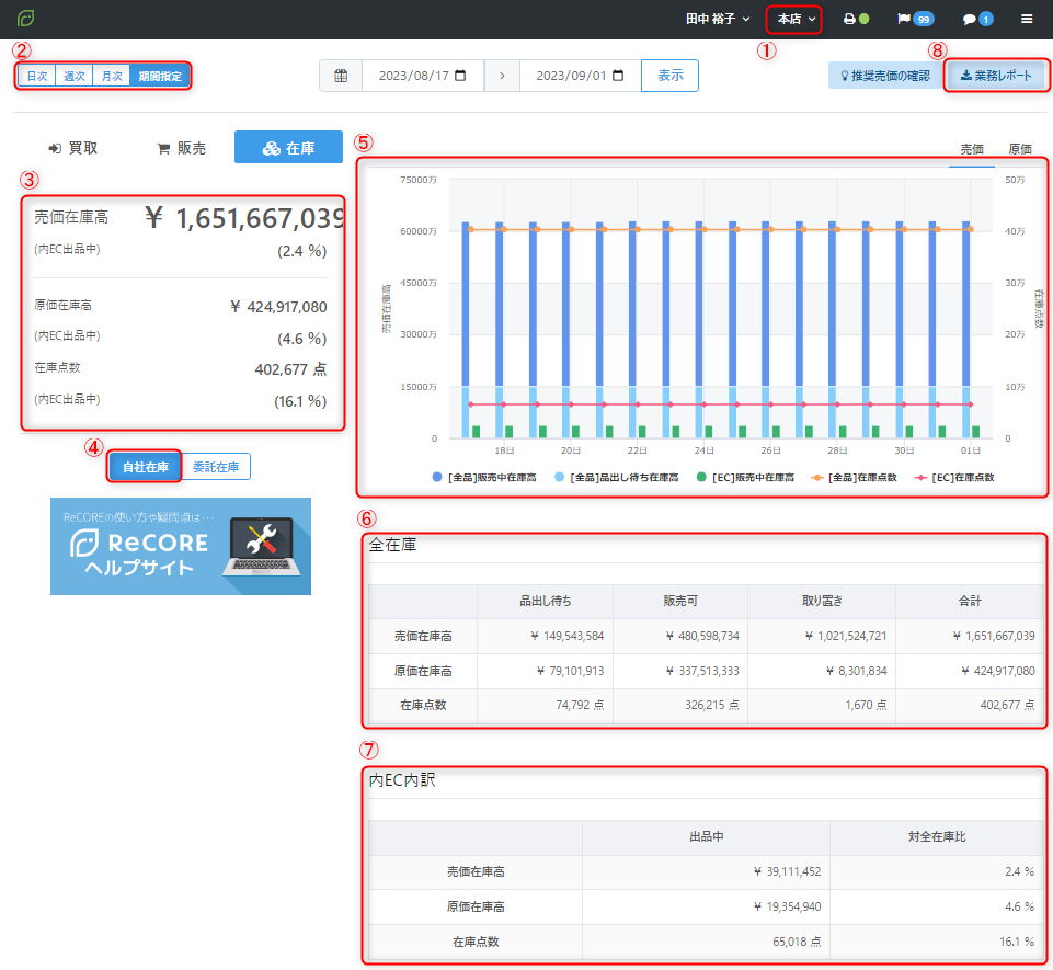 指定した期間中の全在庫の各状況『品出し待ち』『販売可』『取り置き』における【売価在庫高】【原価在庫高】【在庫点数】を確認できます。