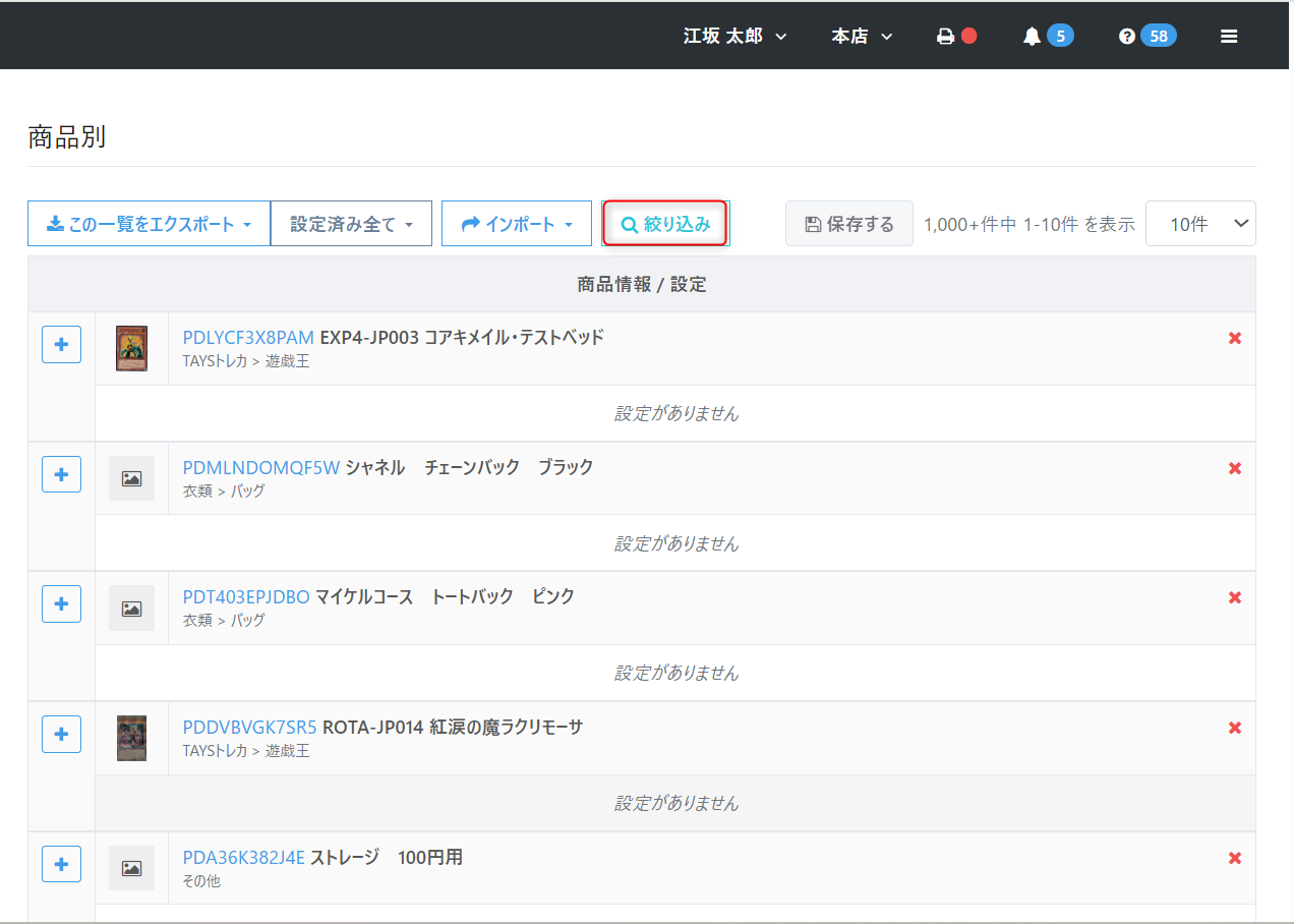 ▼各【設定】メニューの「商品別」へ入力検索後:非表示