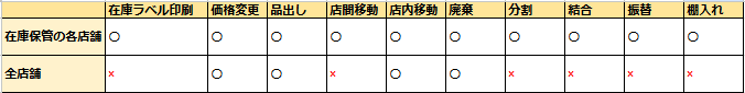 以下は、在庫を保管する各店舗からの操作と全店舗における操作の可否です。