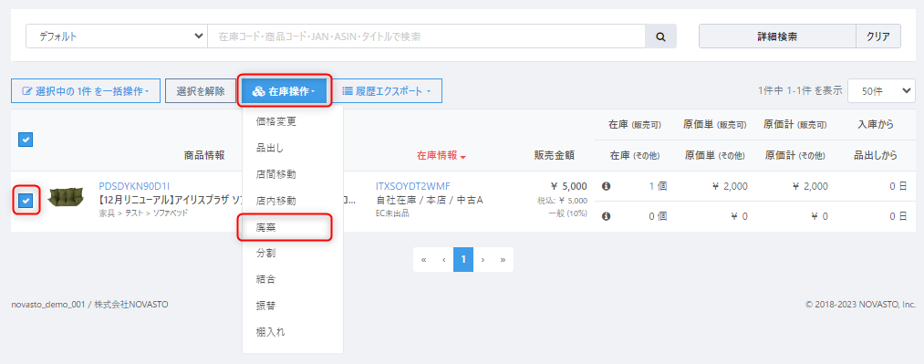 ③廃棄したい商品の左側にチェックをつけ、【在庫操作】より【廃棄】ボタンをクリックする