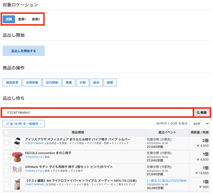 在庫の保管場所である店舗や全店舗から操作が可能です。