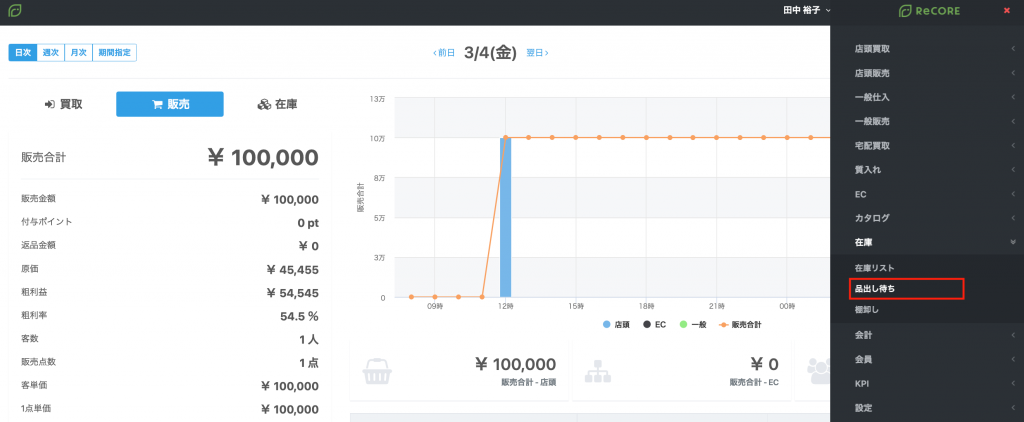①ReCOREの【在庫】メニューから、【品出し待ち】を選択する