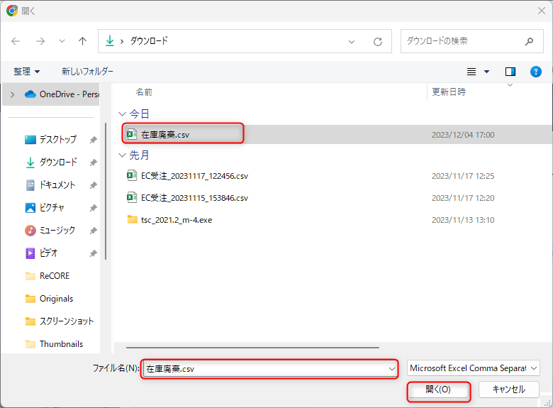 先ほど作成した廃棄データを指定のうえ、【開く】をクリックすることで、CSVデータの内容が反映されます。