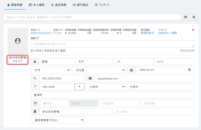 なお、新規作成の場合は「会員ID」「会員コード」を空白にし、会員情報のみ入力