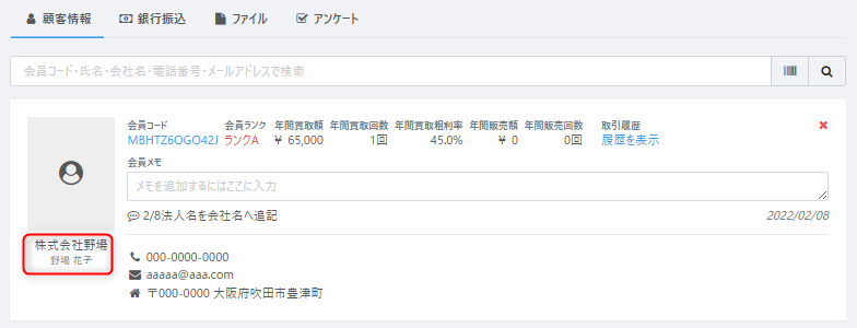 登録後、販売ケース詳細の画面に戻り、会員情報の検索ボックスにて再びカードの会員バーコードを読み取ると、先ほど会員情報に登録したお客様情報が表示されます。