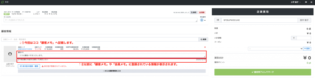 店頭買取の【新規買取】画面では、買取を確定した際に【顧客メモ】(一般仕入では【会員メモ】)の内容が会員情報の【会員メモ】に登録されます。