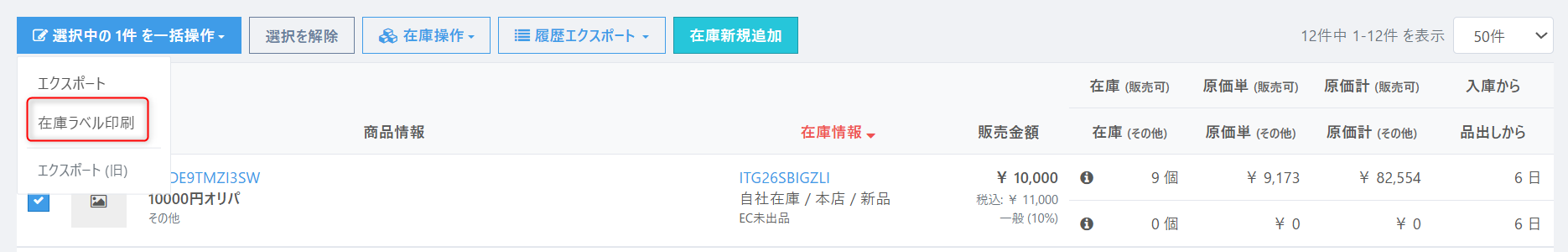 「選択中の〇件を一括操作」をクリックし、表示された選択肢の中から「在庫ラベル印刷」をクリック。