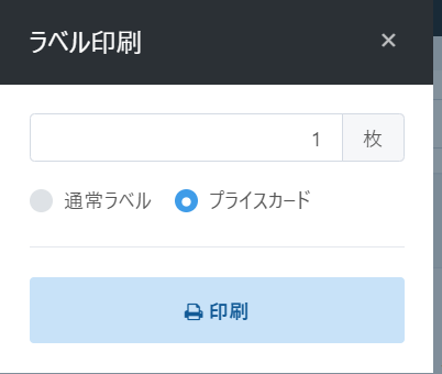 立ち上がった「ラベル印刷」画面上で、【プライスカード】にチェックをつけて、枚数を入力し「印刷」をクリックして印刷を行う。