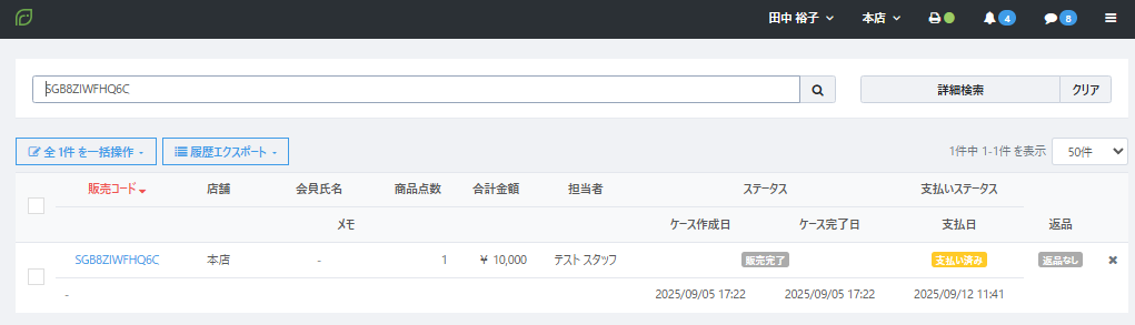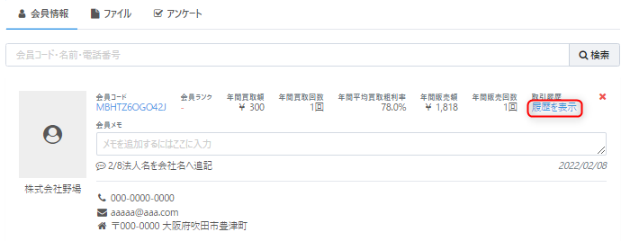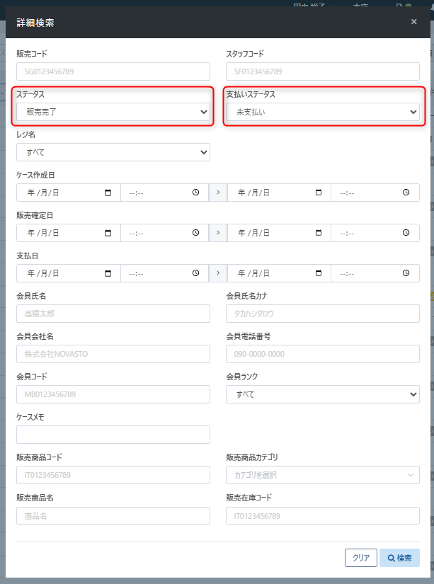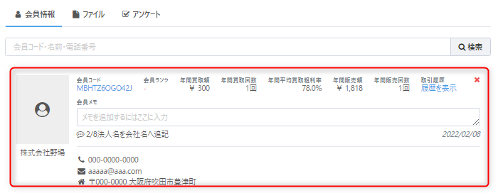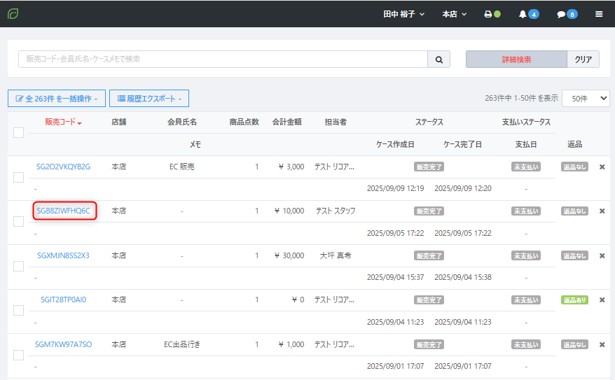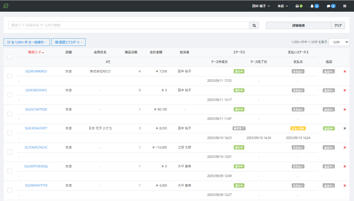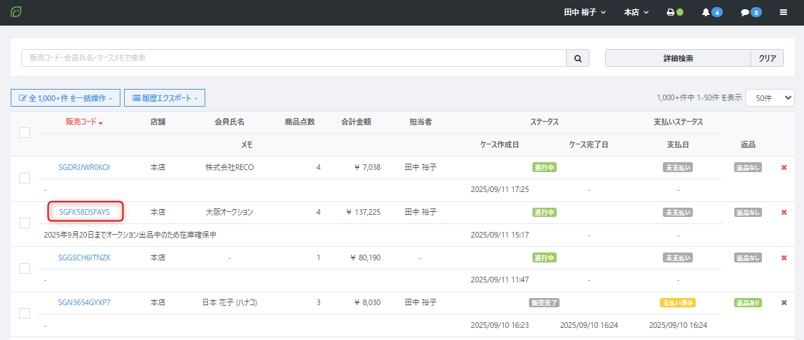 【販売コード】【ケースメモ】【会員氏名】などから検索が可能です。