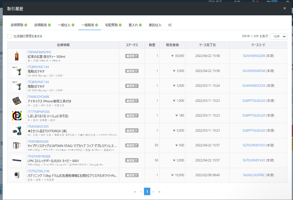 【一般販売>ケースリスト】をクリックにより、処理したケースの一覧が表示されます。