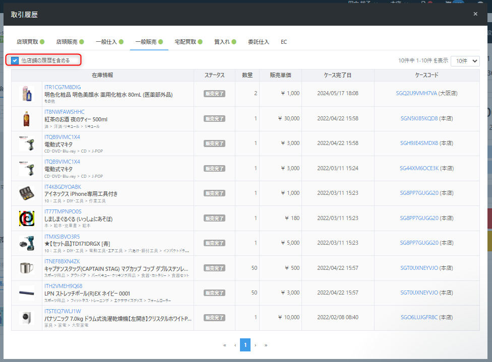 【他店舗の履歴を含める】にチェックをつけると、全ての履歴が表示されます。