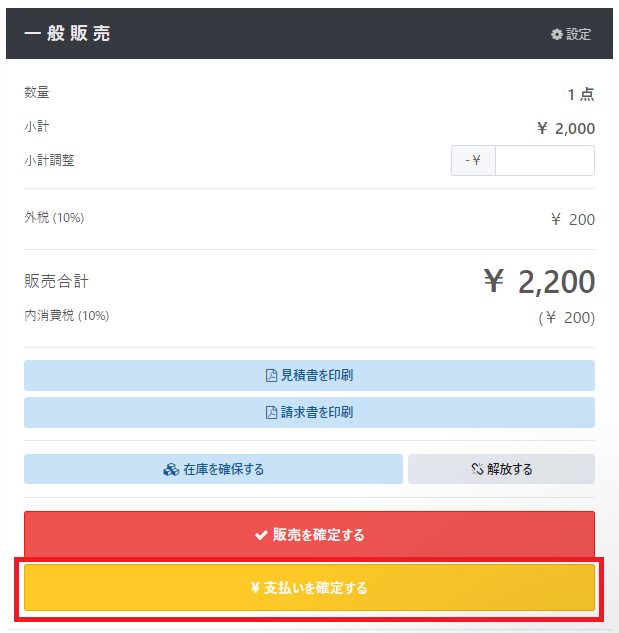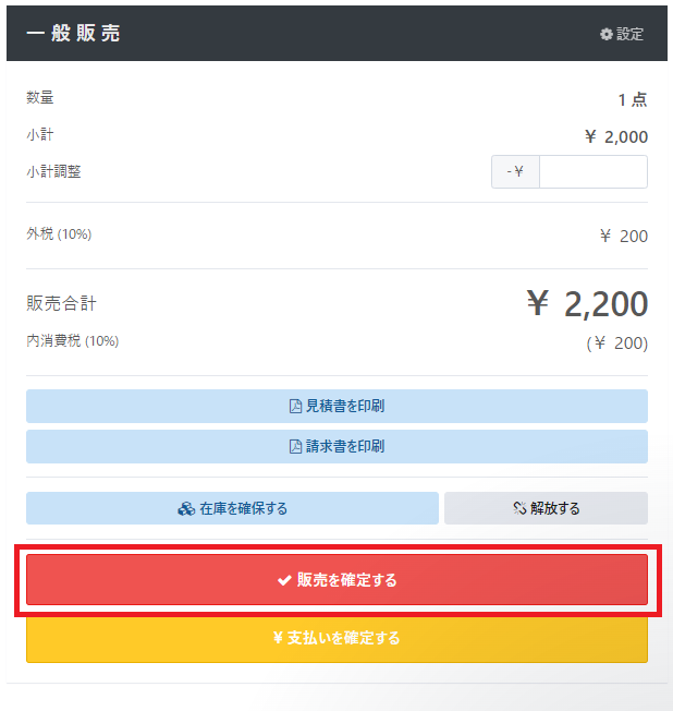 【販売を確定する】クリックにより、在庫の出庫が確定します。