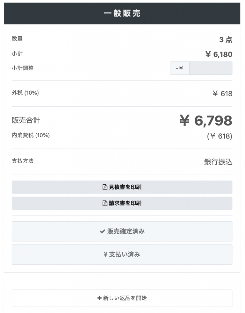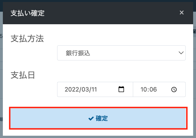 【支払いを確定する】クリックにより、支払いが確定しダッシュボードや経理レポートに販売が計上されます。