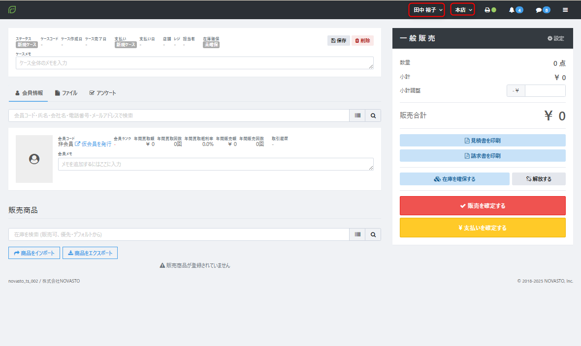 画面右上に表示されるスタッフ名と店舗名を確認します。
