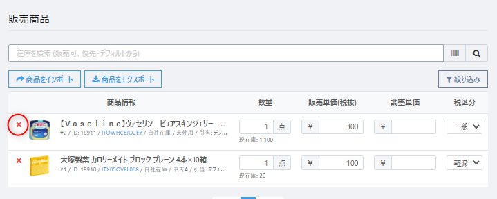 商品名の左ヨコにある赤い【×】ボタンをクリックして削除が可能です。