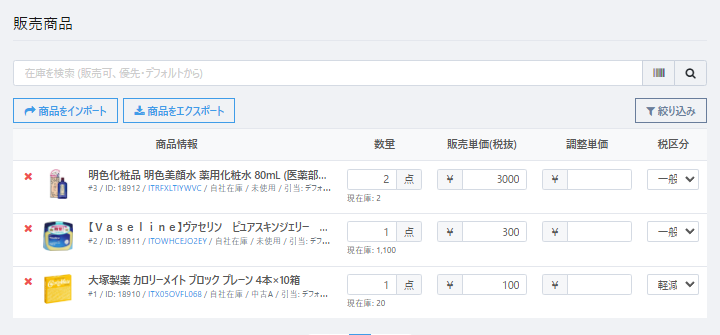 調整単価 (任意) | 整数の半角数字のみ | 販売金額に対して商品の調整する場合のみ、半角数字で調整金額を入力 |