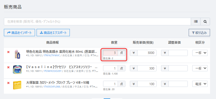 ※同じ在庫商品が複数ある場合、販売点数分だけバーコードを読み取りすることで反映が可能です。「数量」に直接数字を入力も可能です。