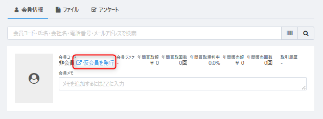 【会員情報】にある【仮会員を発行】ボタンをクリックします。