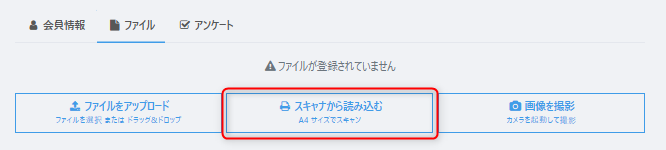RECOREのコネクターと連携するスキャナー機器を設定済の場合のみ、利用可能です。基本的にはA4サイズで読み取り反映されます。