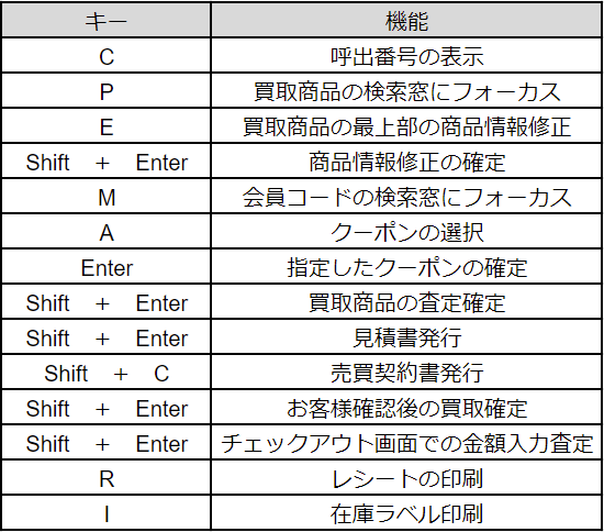 以下に各メニューでご利用いただけるショートカットキー一覧を記載いたしますのでご活用ください。