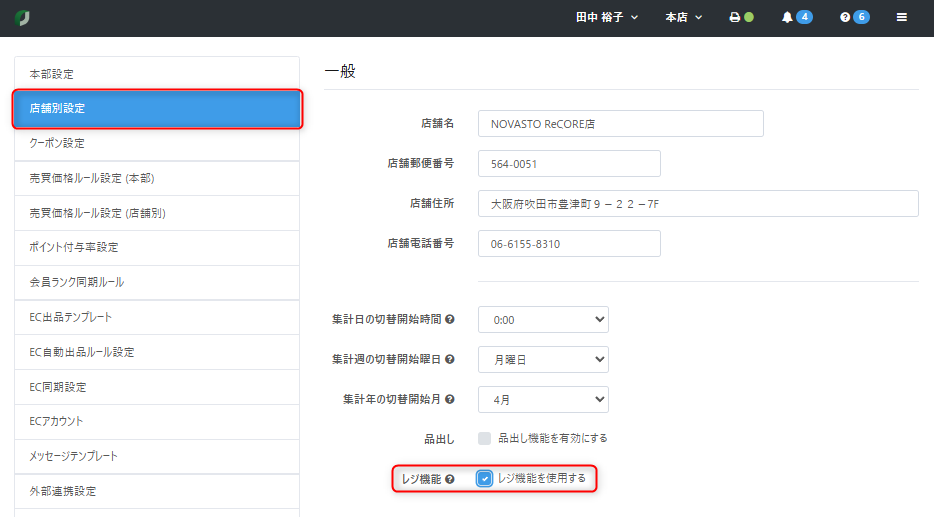 【設定】>【店舗別設定】項の「一般」にある【レジ機能を使用する】にチェックをつけ、画面一番下にある【保存する】をクリックして設定を保存します。